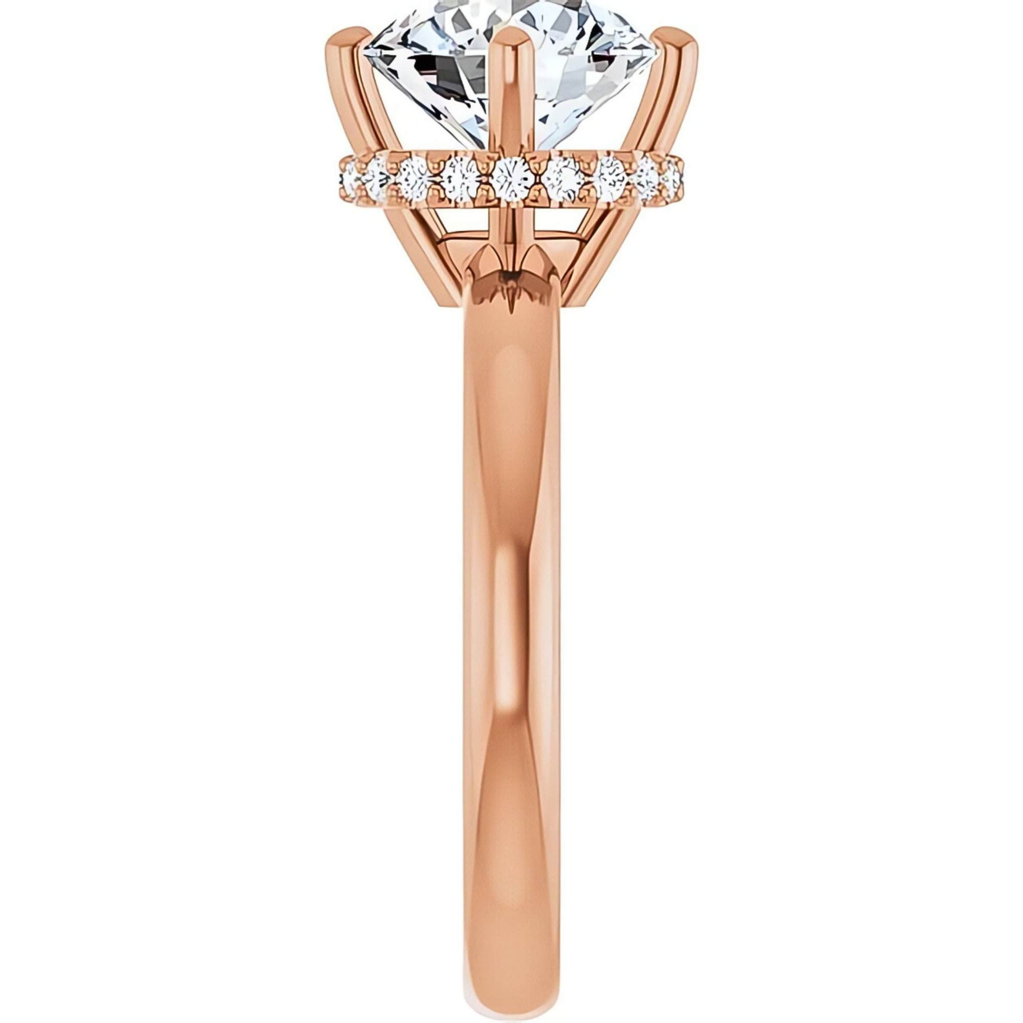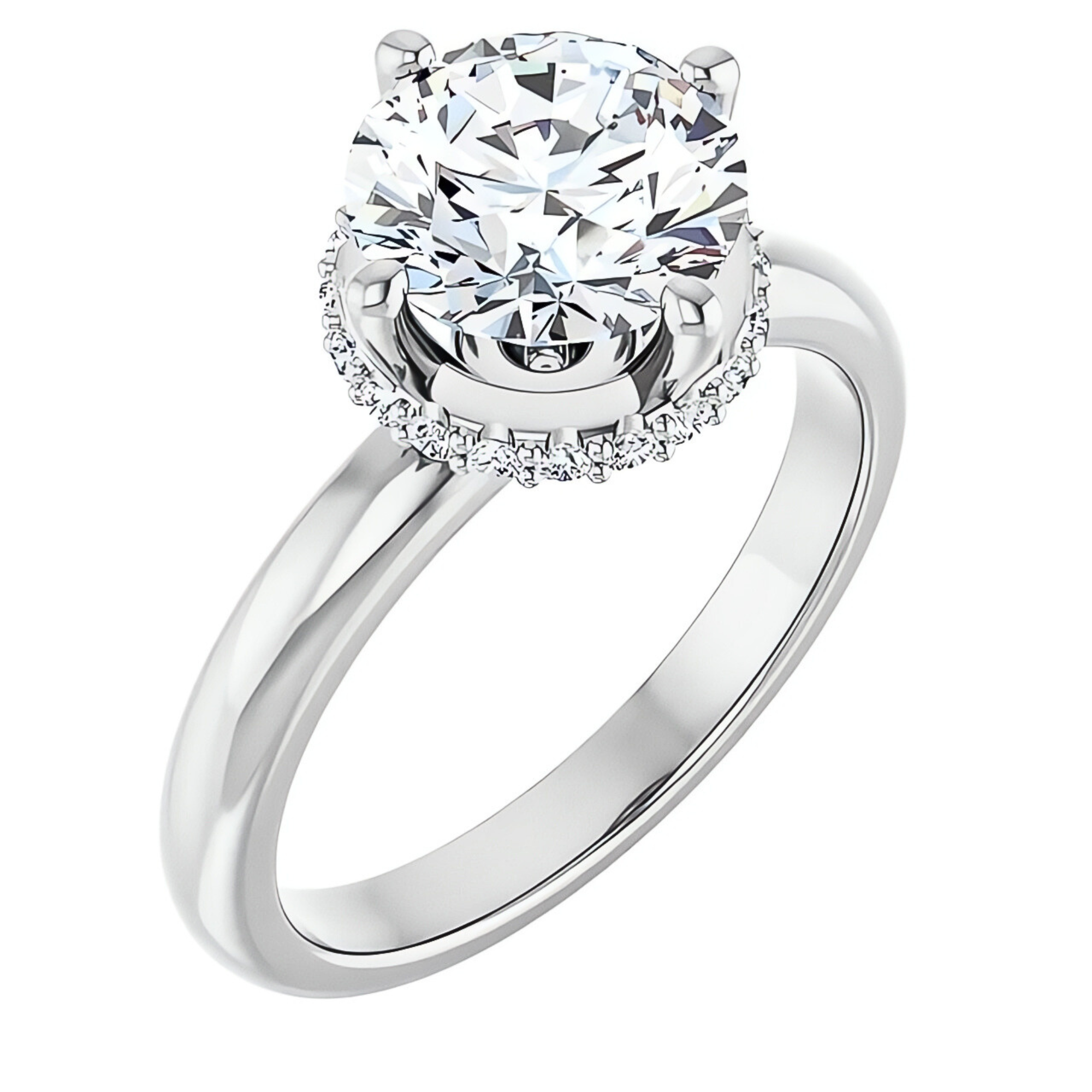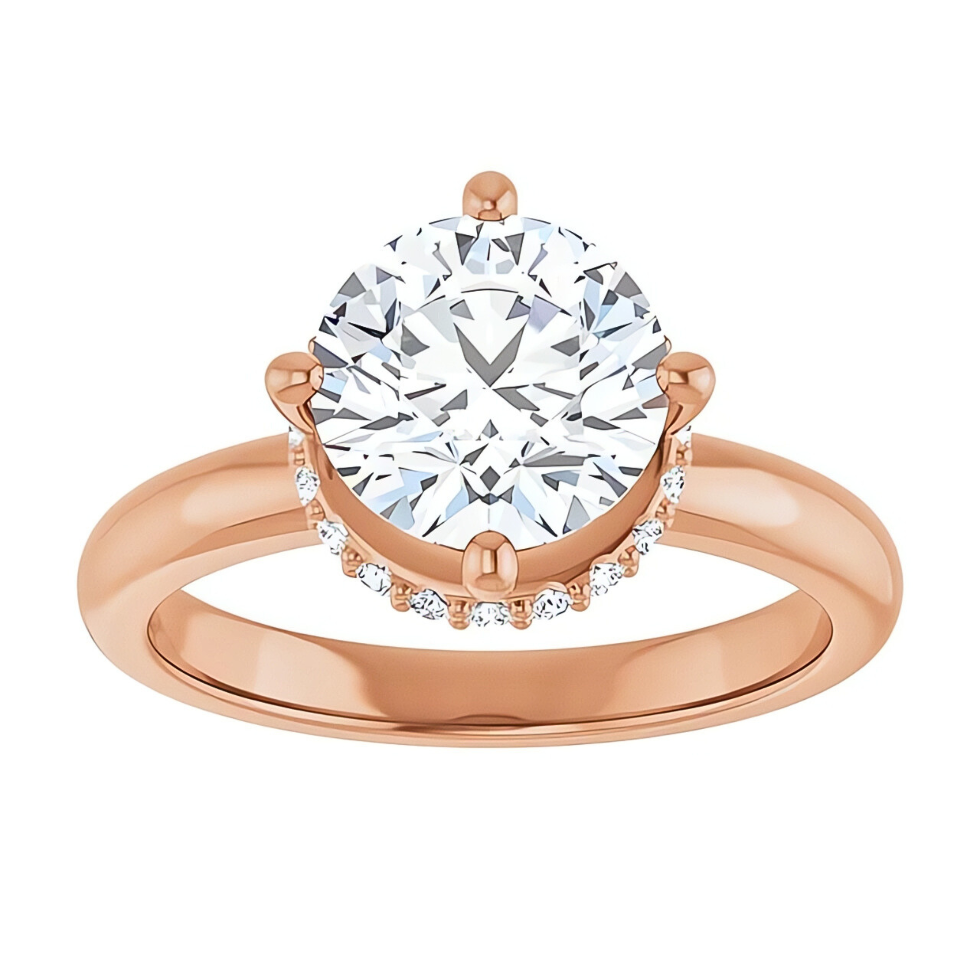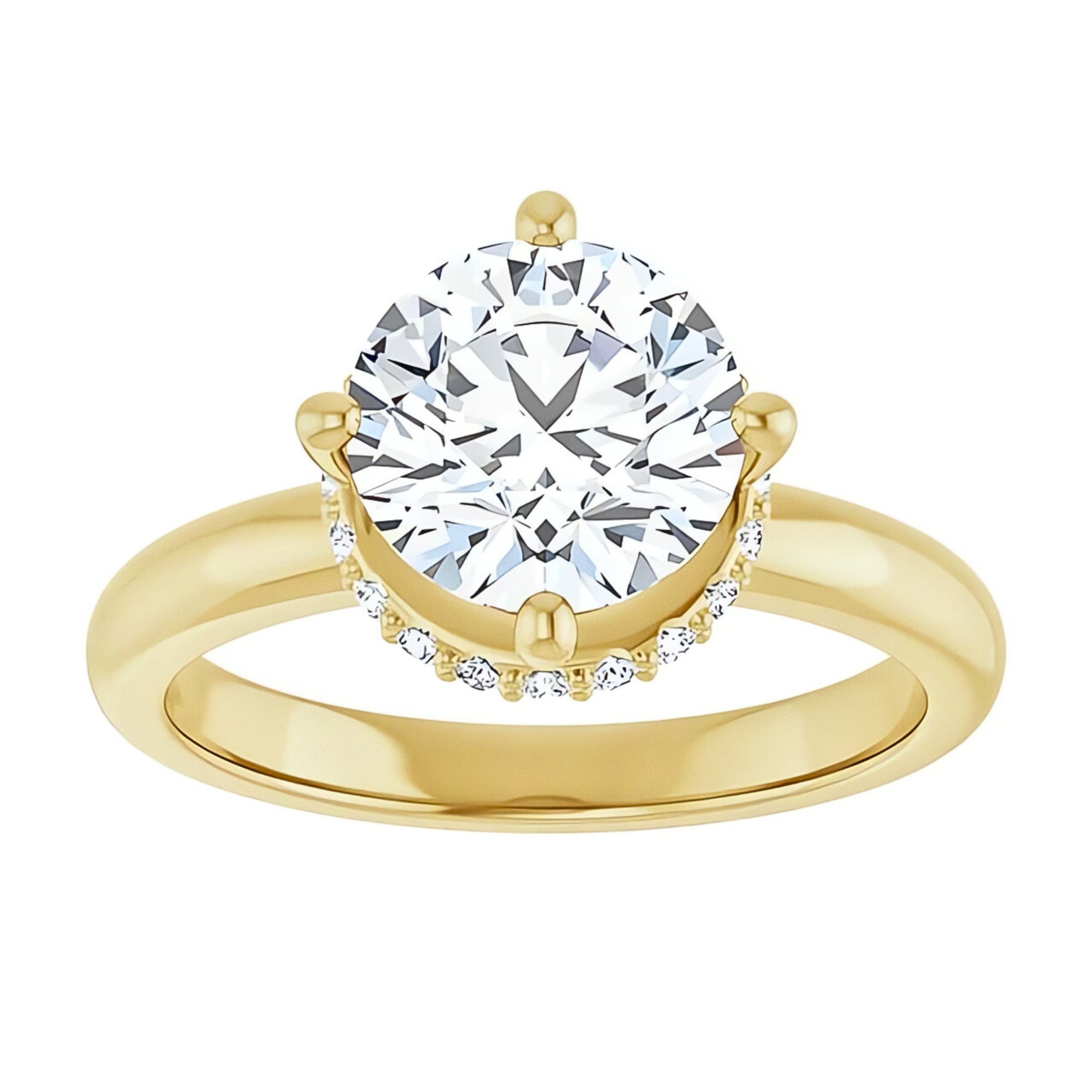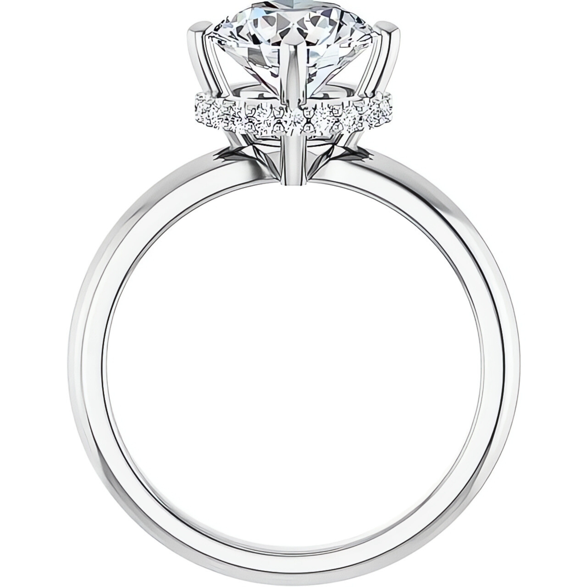 This modern setting features compass-set prongs that securely hold your center stone while adding a unique flair. Surrounding the prongs is a subtle hidden halo, designed to enhance the stone’s brilliance.