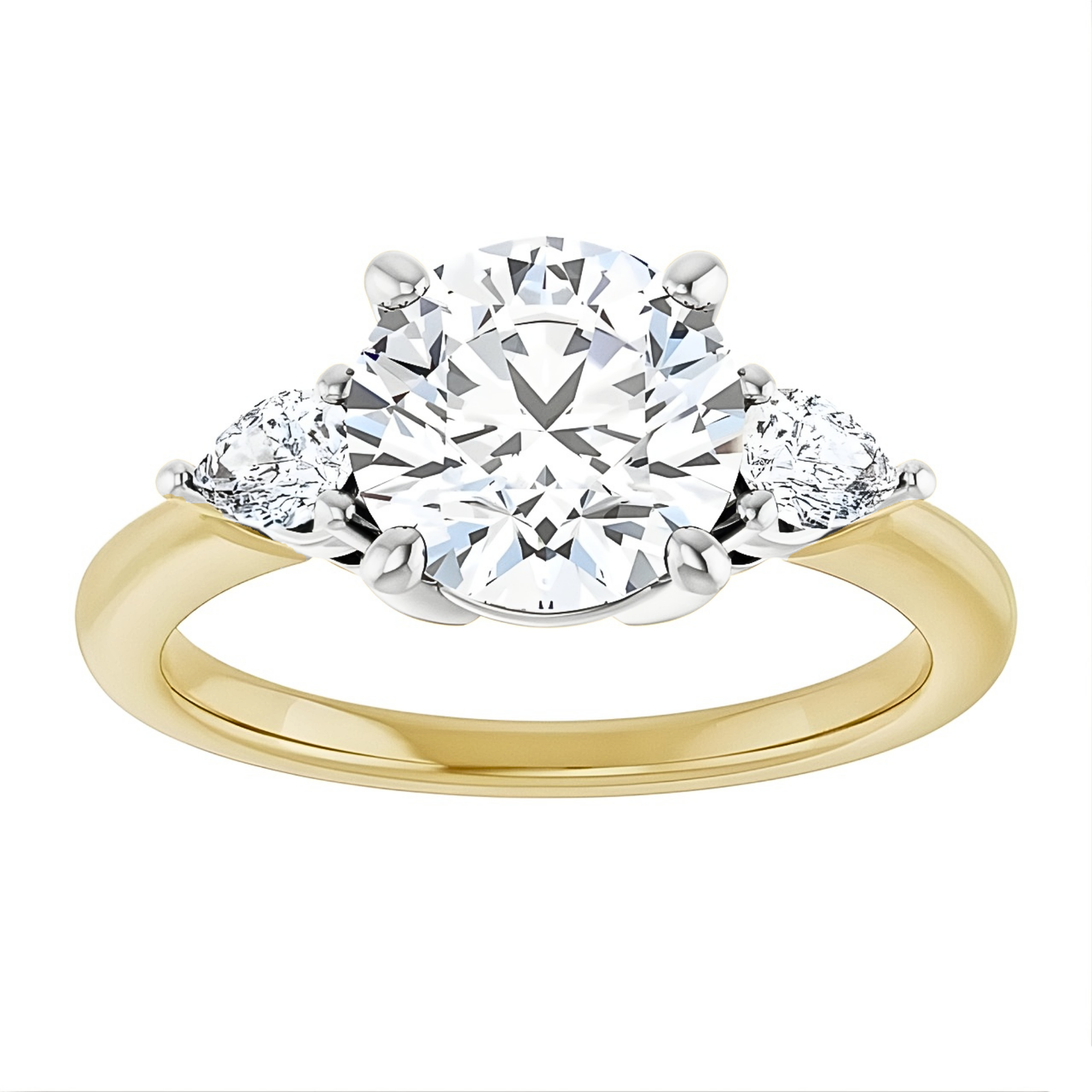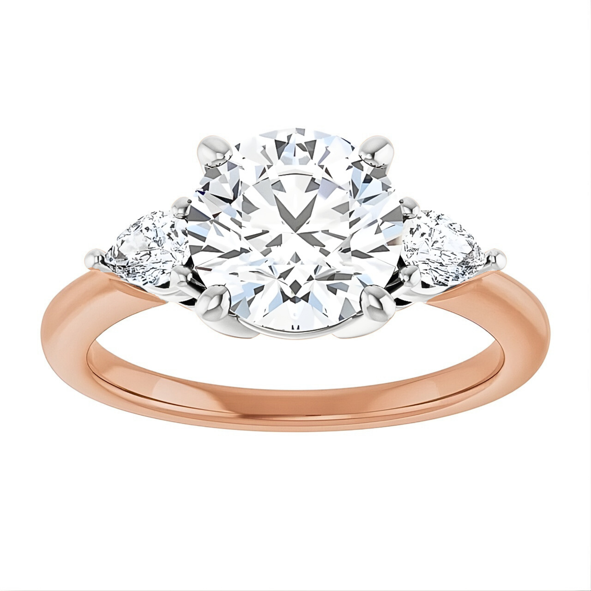 This setting is a unique twist on the timeless three stone design. The stunning pear-shaped side stones add a touch of elegance to this classic setting. Elevate your style with this one-of-a-kind piece.