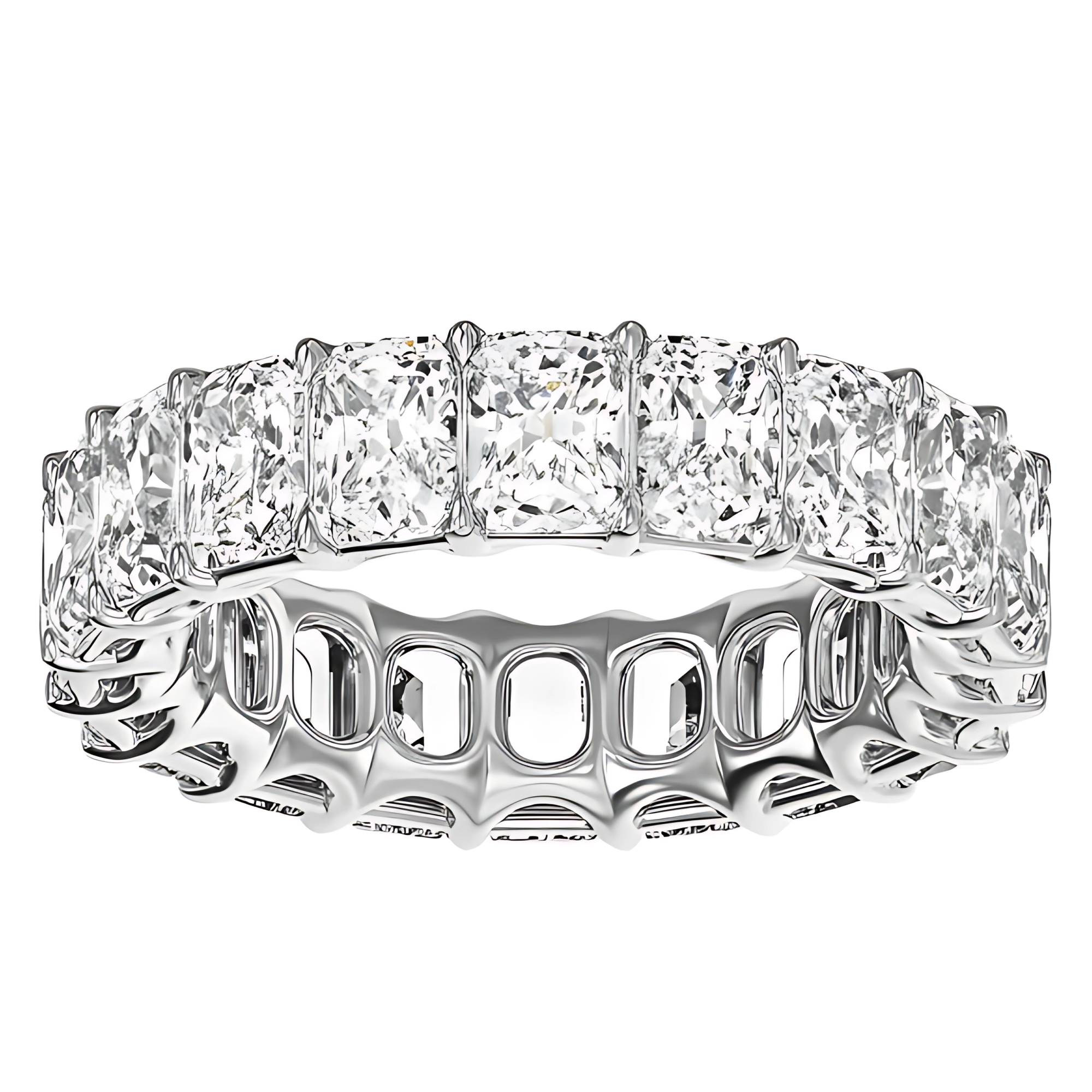This eternity ring boasts stunning radiant lab grown diamonds in an elegant u-prong setting. Adorn your finger with this beautiful ring that sparkles with every movement.
