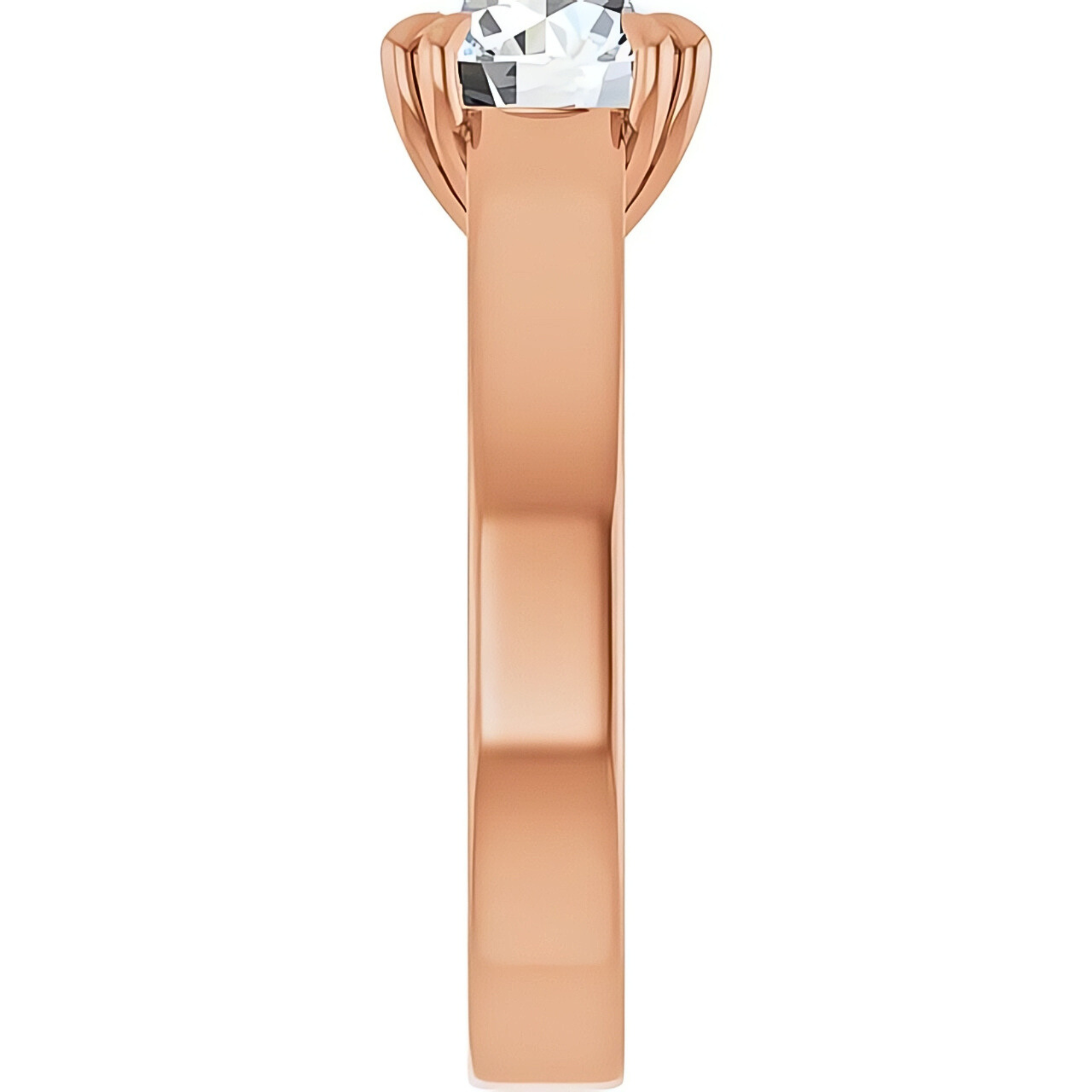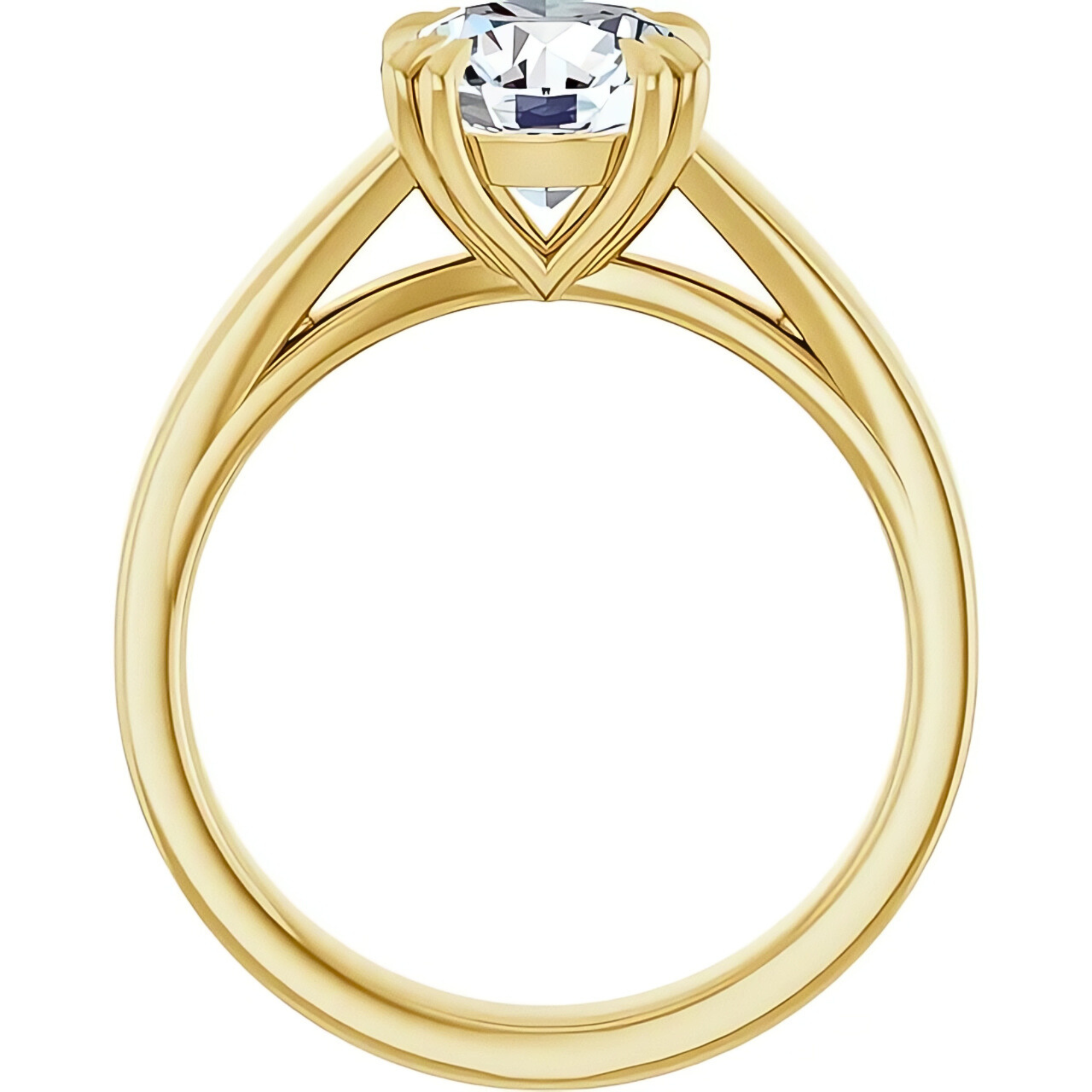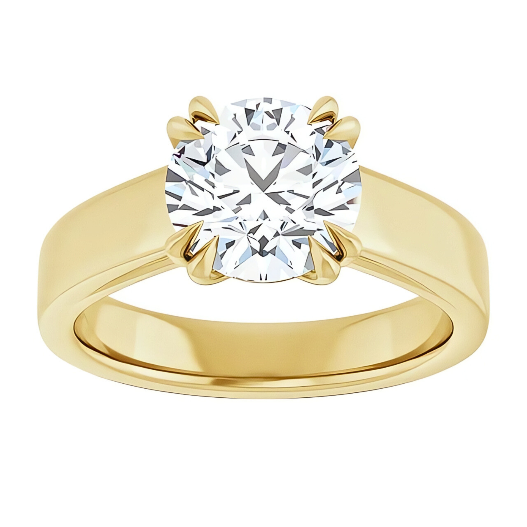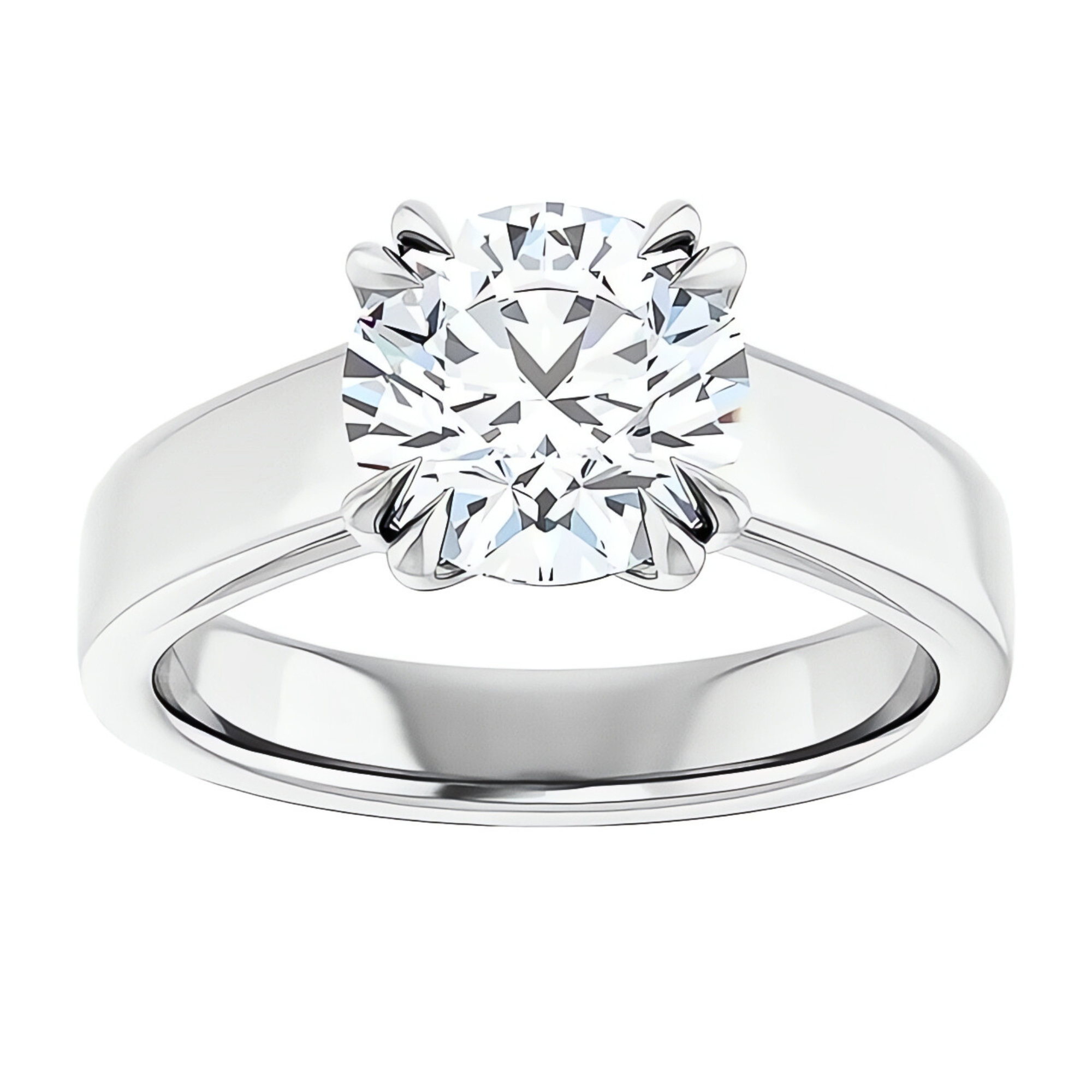 This solitaire setting features a wide band that offers a bold, elegant foundation for your center stone. The cathedral design gracefully arches upward, enhancing the ring’s profile and adding a touch of sophistication. Double claw prongs securely hold your chosen center stone, ensuring both protection and maximum light exposure for brilliant sparkle.