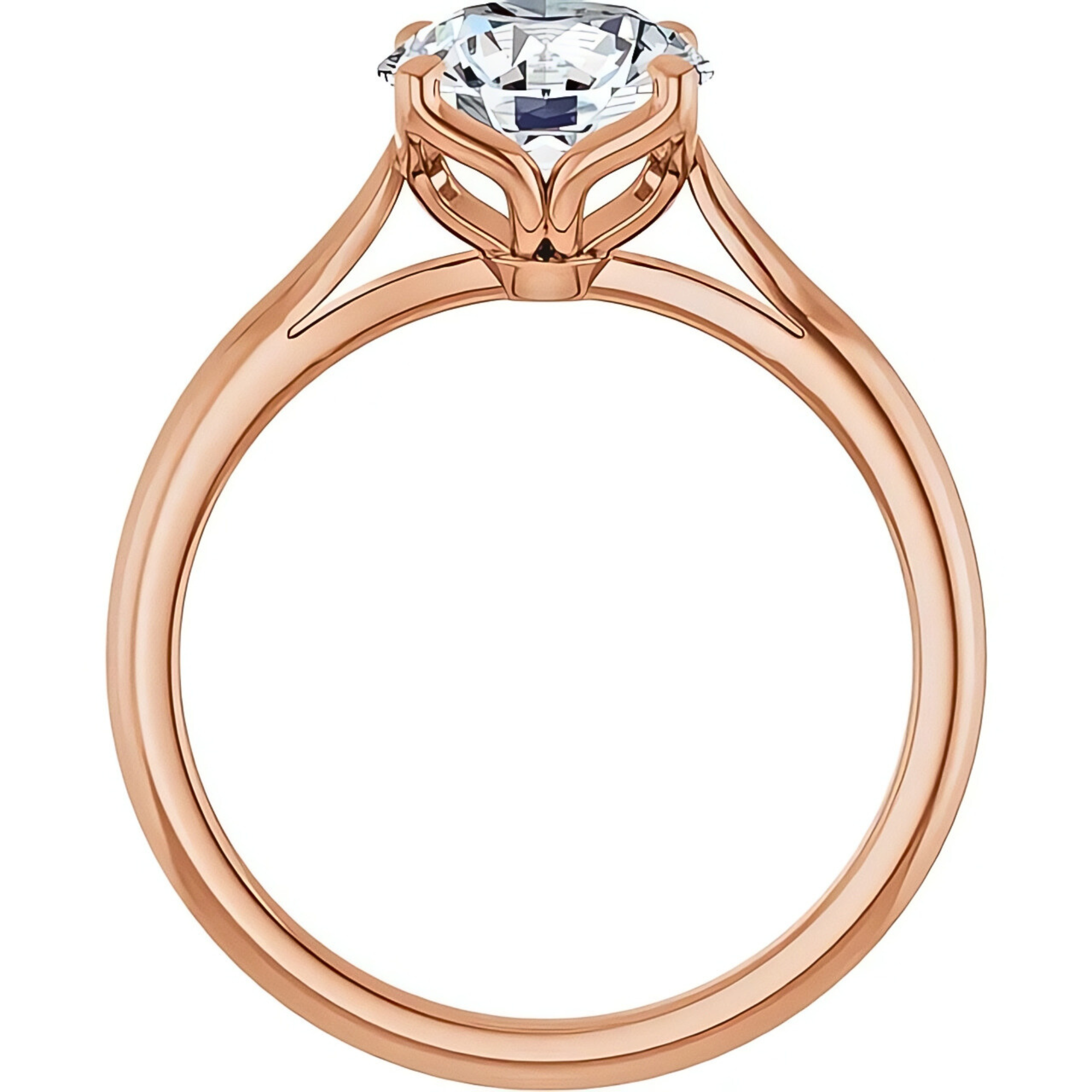 This elegant design features graceful cathedral arches that raise the center stone for maximum brilliance, while delicate tulip-shaped prongs add a romantic floral touch. The refined architecture ensures your diamond remains the stunning focal point while providing secure, stylish support.