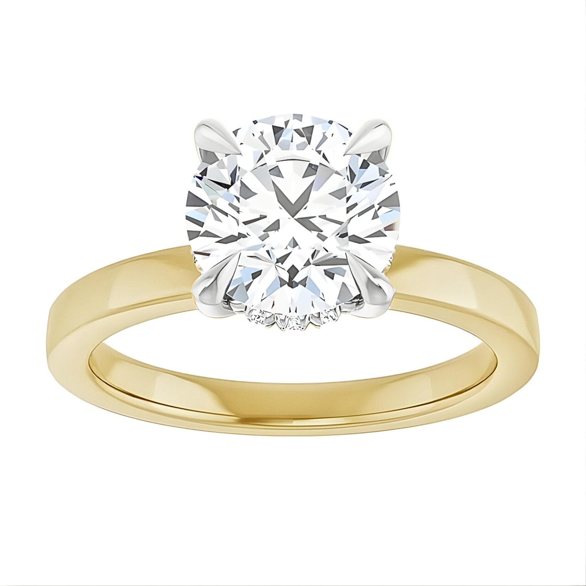 This solitaire engagement ring setting features claw prongs and a hidden halo of dazzling diamonds on the gallery rail, providing sparkle from every angle. This style sits flush with a straight wedding ring to ensure a seamless ring stack.