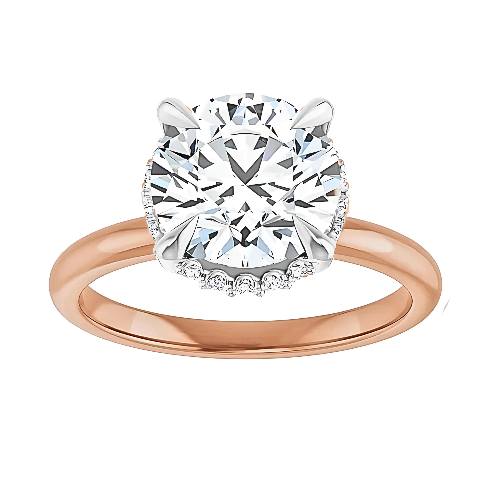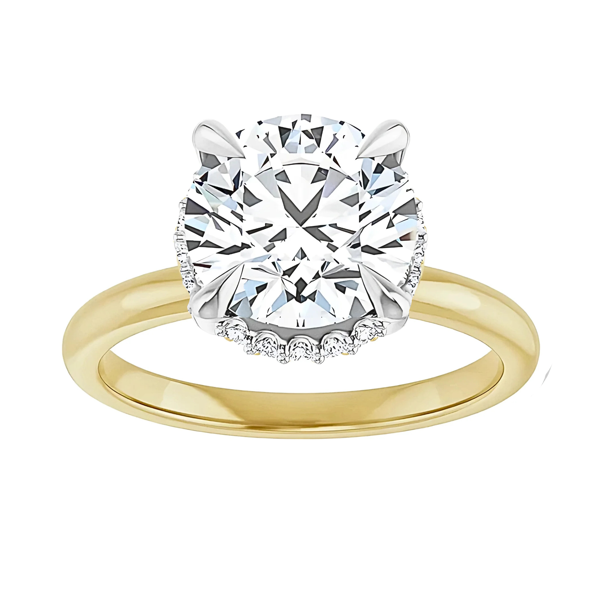 The classic solitaire design is elevated with a hidden halo of shimmering diamonds set along the gallery rail, but on the outside of the prongs, adding a touch of sparkle to your special moment.