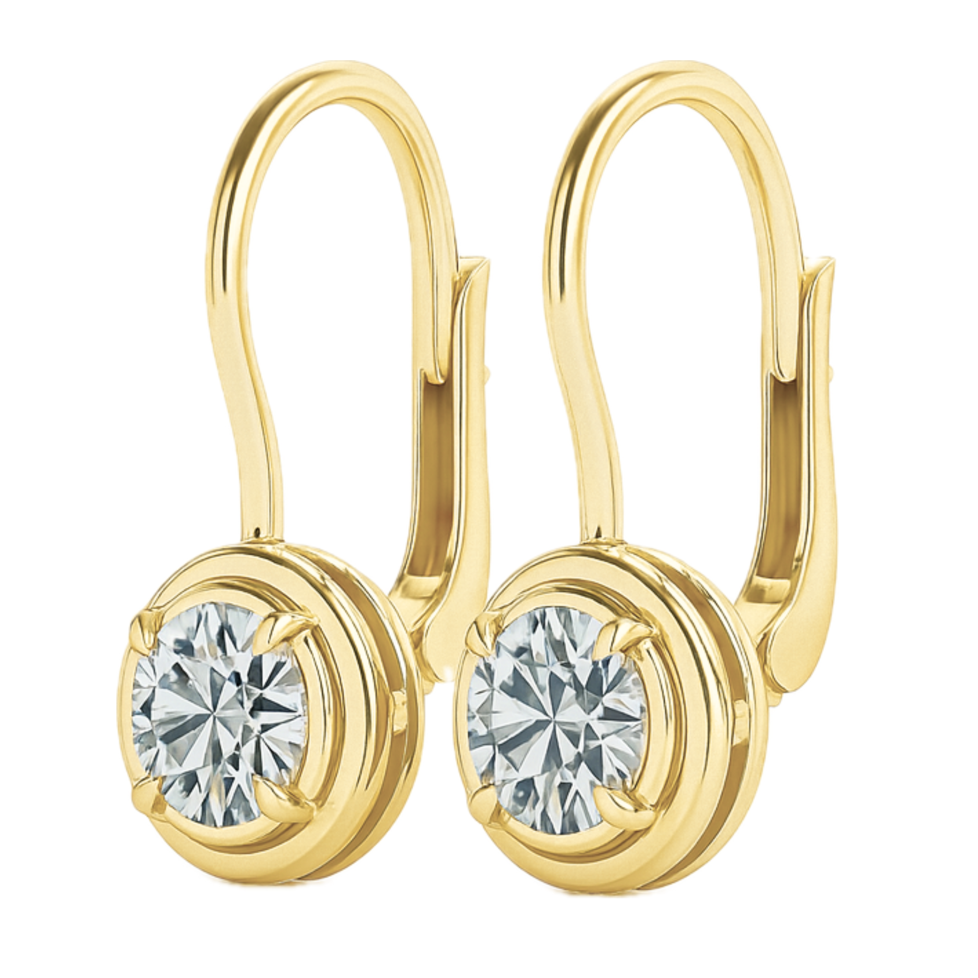 These dazzling earrings showcase a total carat weight of 2, featuring 1 carat diamonds in each ear. Each stone is bezel set with four claw prongs, providing both elegant style and reliable security. Designed with a lever back closure, these earrings make a sophisticated statement for any outfit.