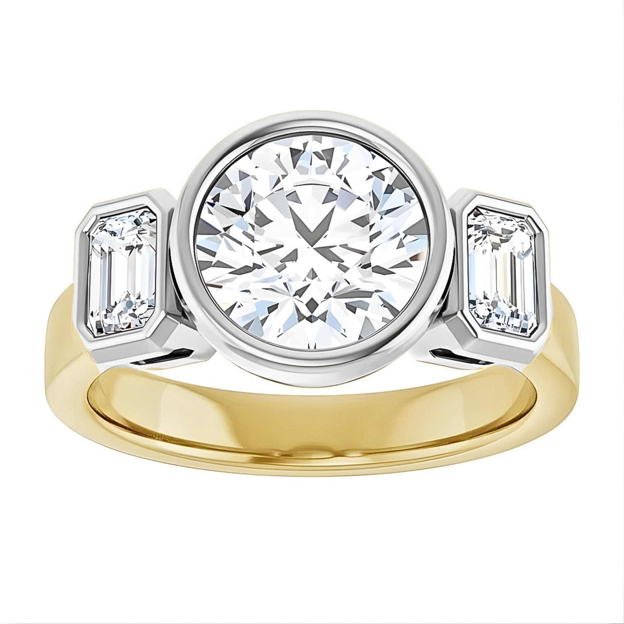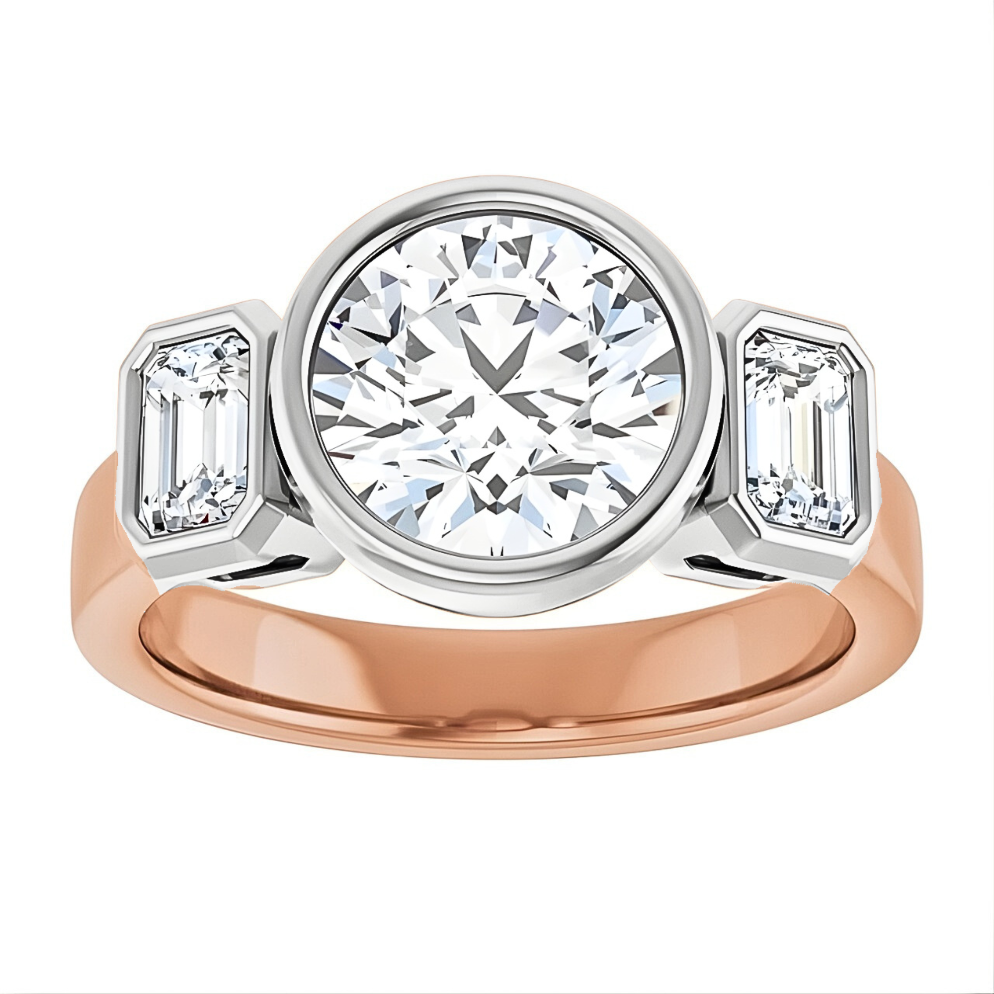 This setting offers a sleek and modern look. With its three stone setting, featuring emerald side stones and a wide band, this ring is perfect for the cool girl who wants to make a statement. Its unique bezel setting adds extra security to keep the stones in place. Elevate your style with this stunning piece.