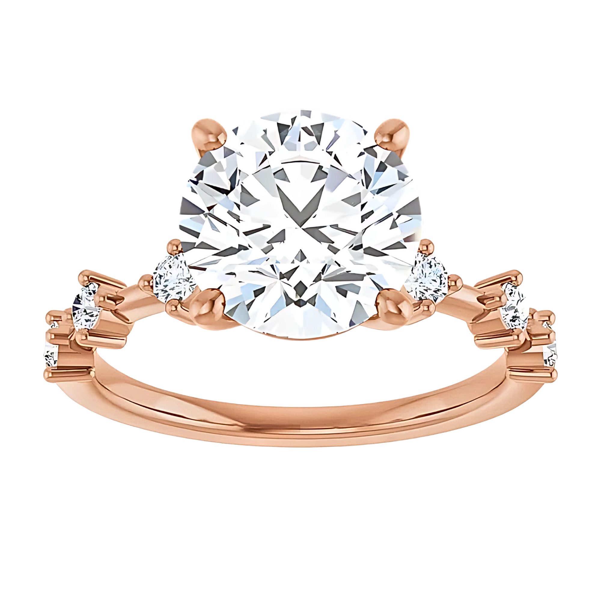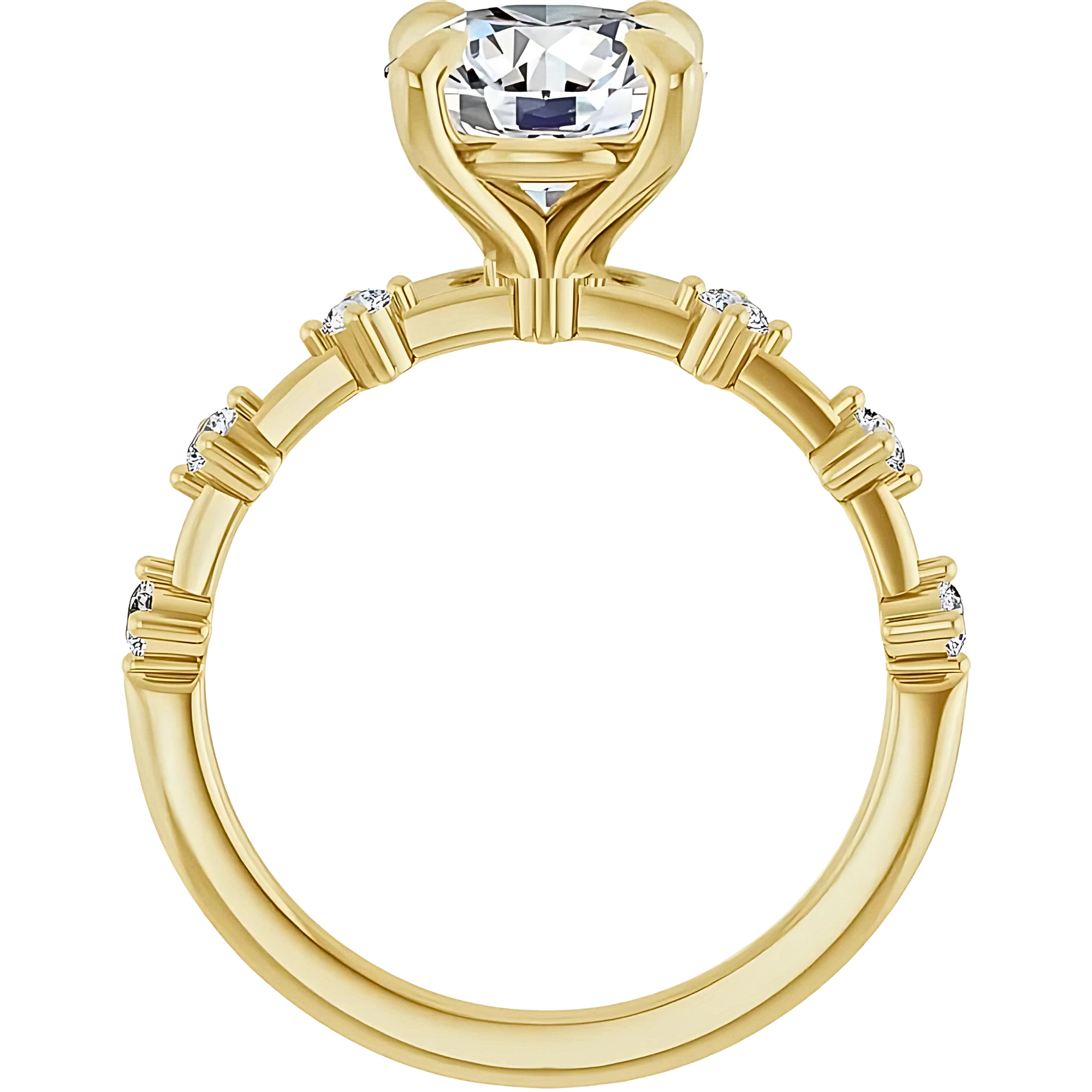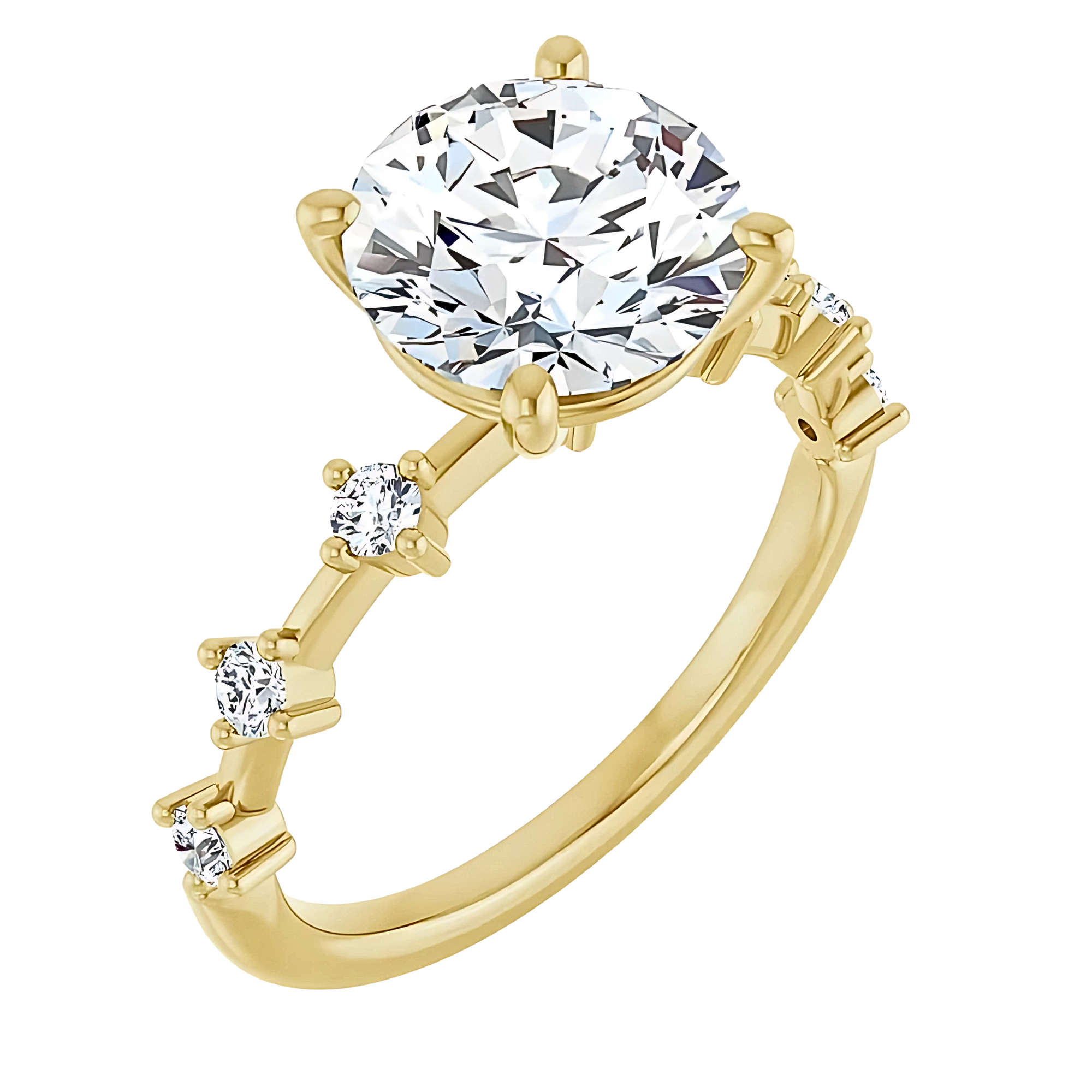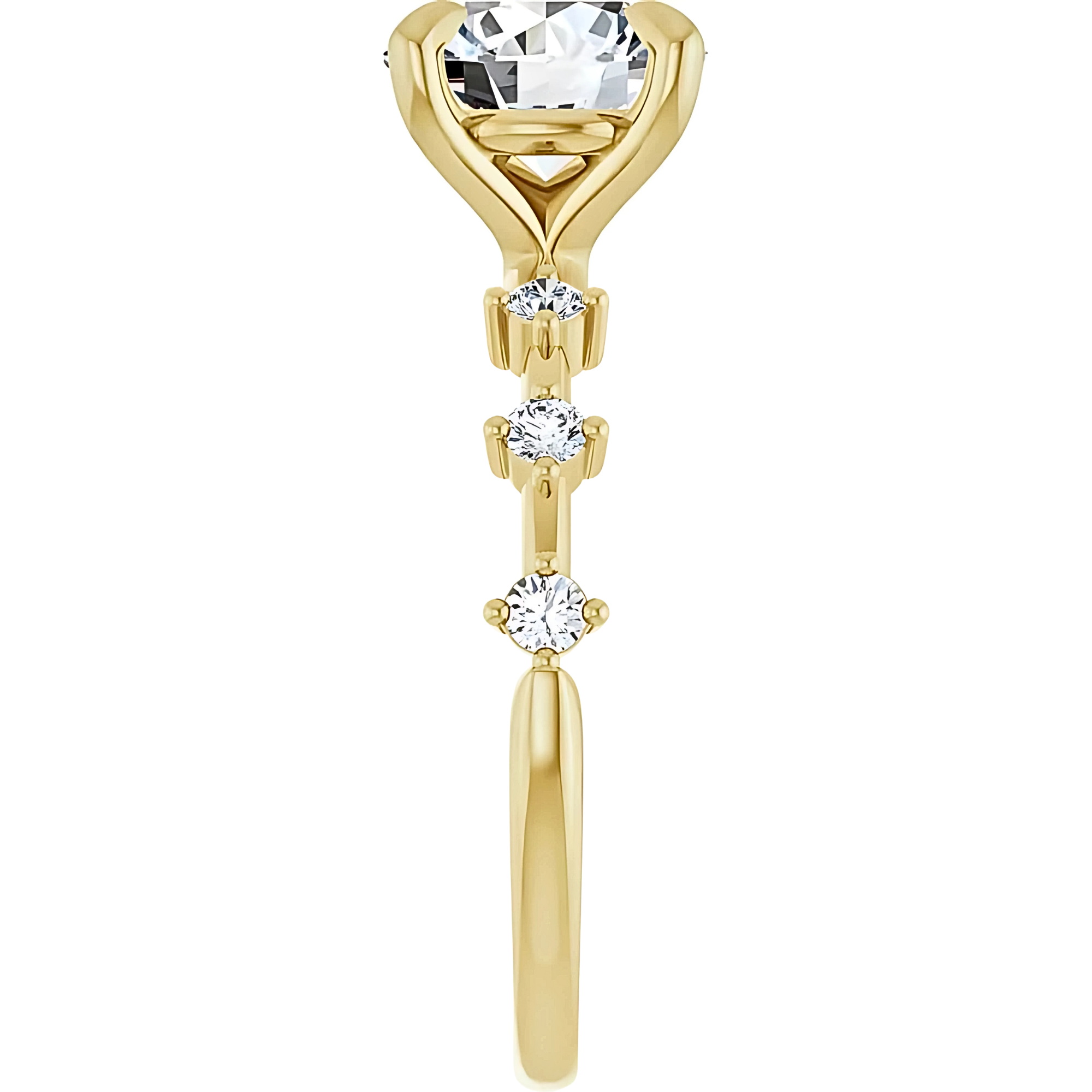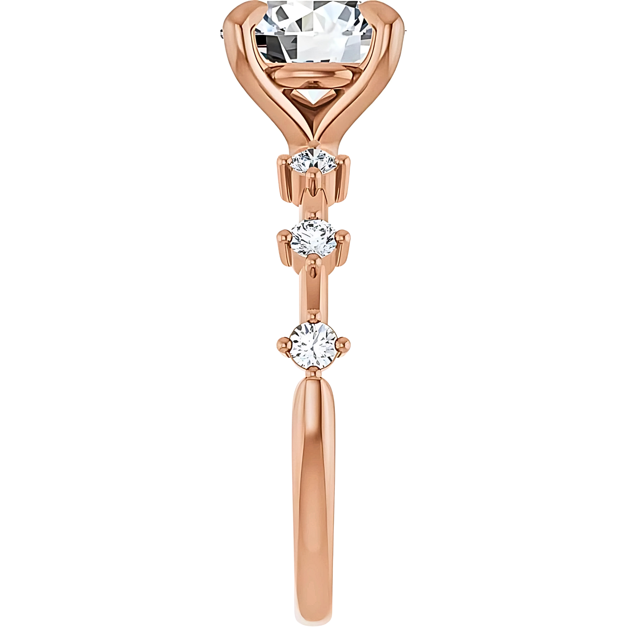 The Rhodes setting features a whimsical design with three diamonds evenly spaced on either side of your chosen center stone, creating a stunning and celestial look.