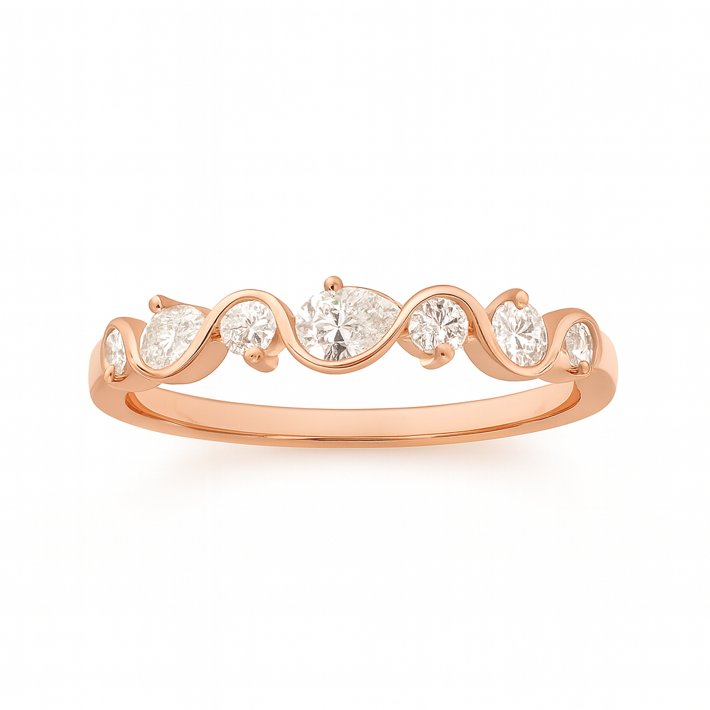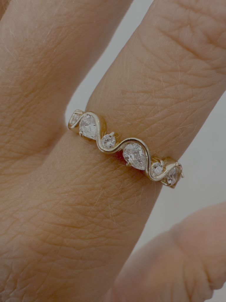 The Sarah Wave Diamond Ring showcases an elegant interplay of pear and round diamonds set in a captivating half bezel design. The flowing, wave-like silhouette creates movement and dimension, allowing light to dance across the stones from multiple angles. This sophisticated piece balances classic diamond brilliance with contemporary styling, making it a striking choice for those seeking a ring that's both timeless and distinctly modern.