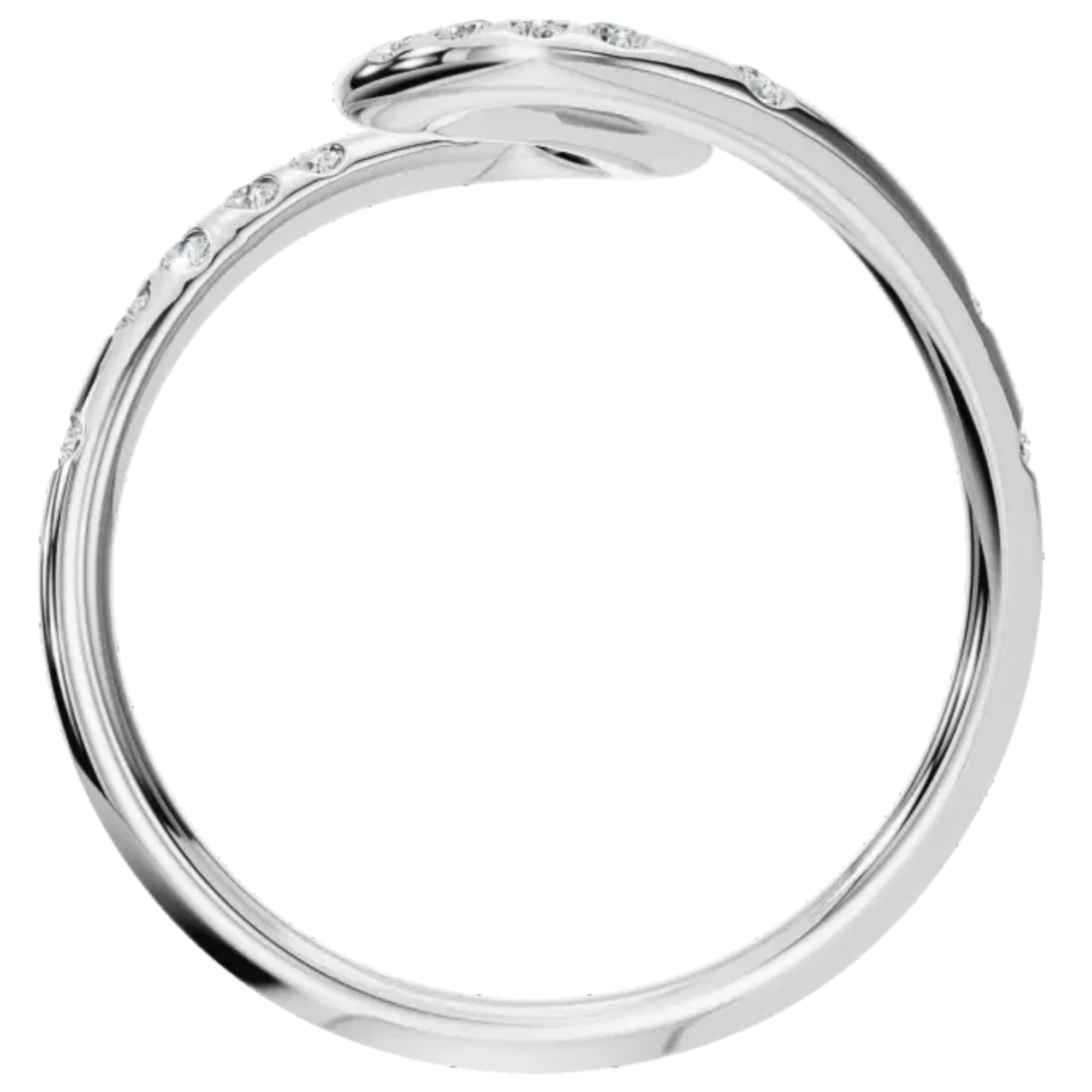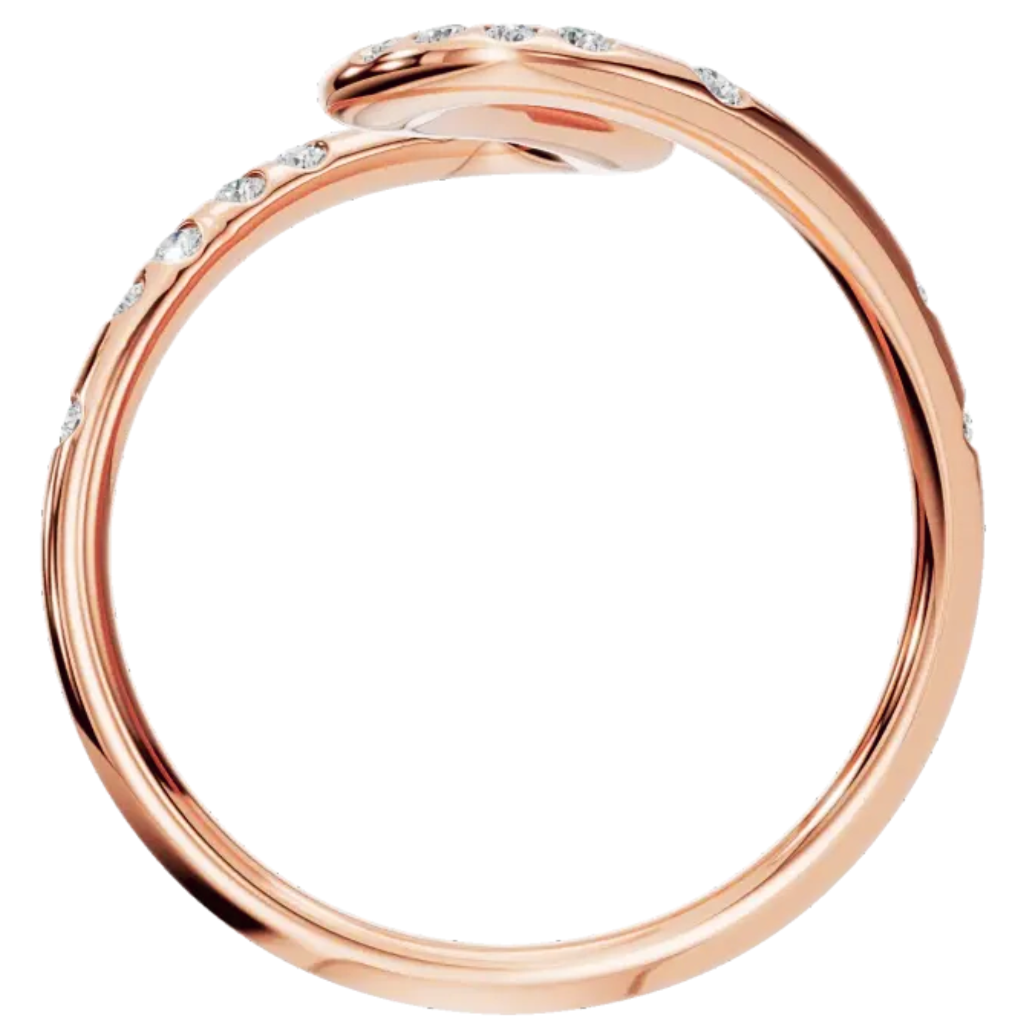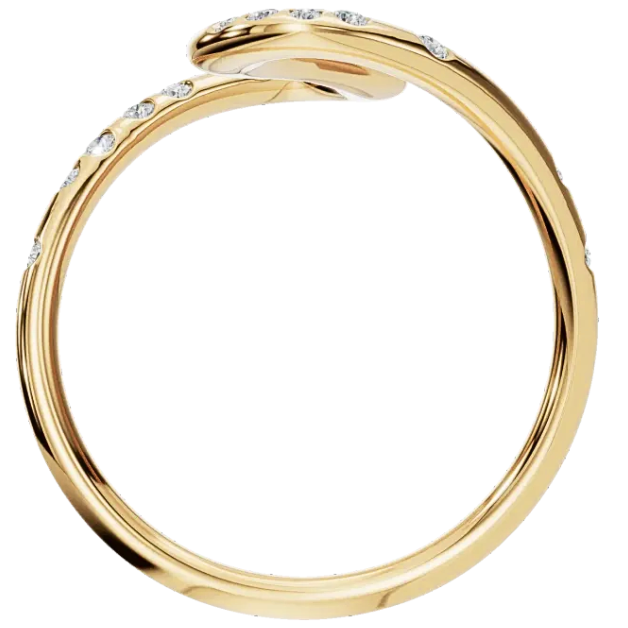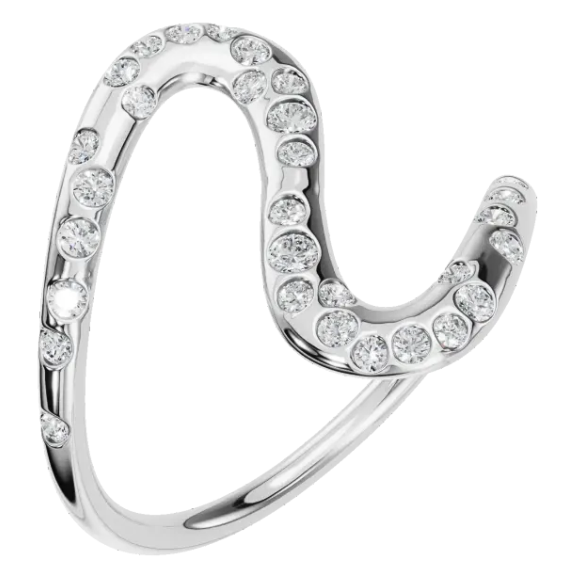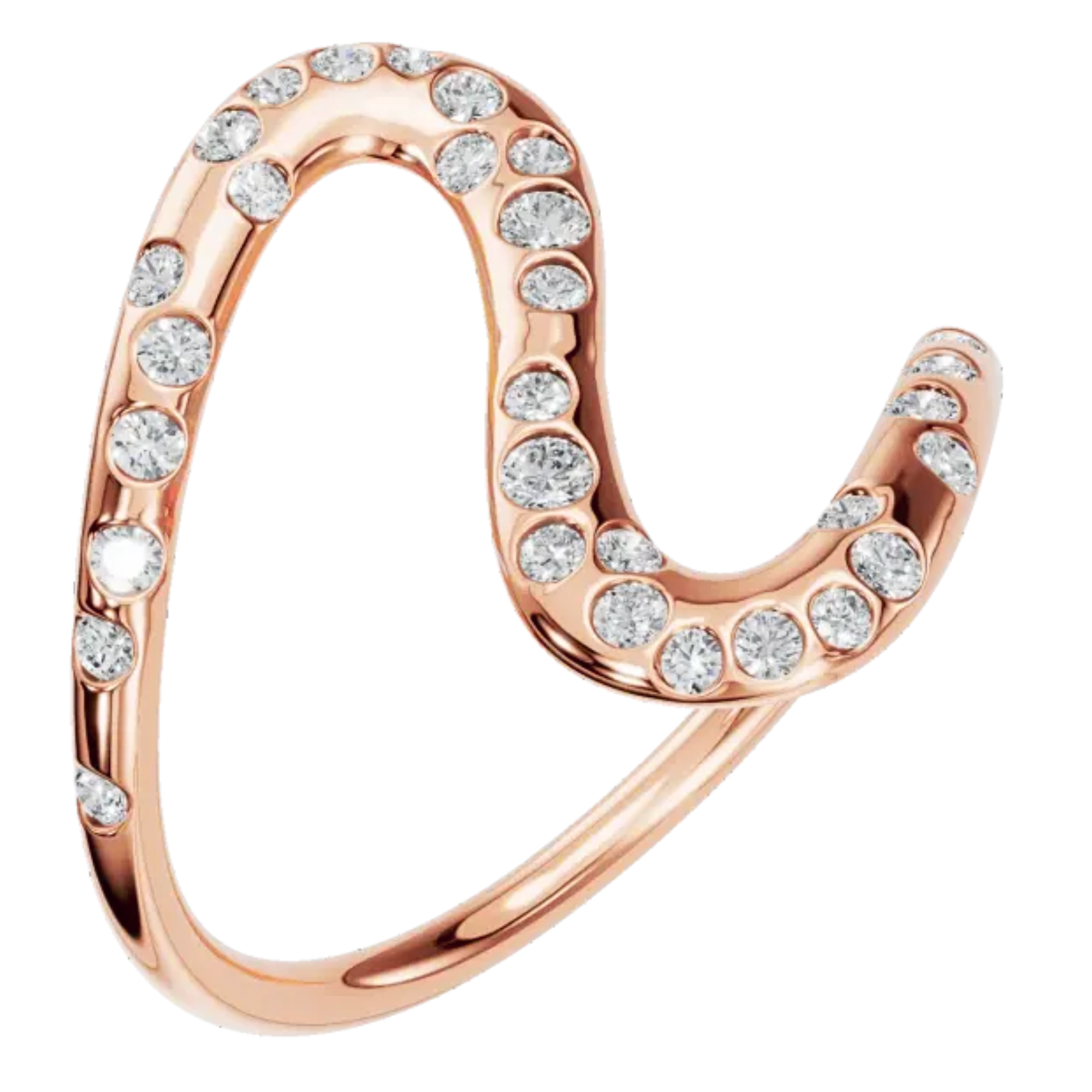 A striking design crafted in lustrous solid gold, this ring is shaped in an elegant, flowing curve reminiscent of a graceful serpent or a winding path. The design features a dazzling array of round-cut diamonds in your choice of lab grown diamonds or natural diamonds, meticulously set along its silhouette.